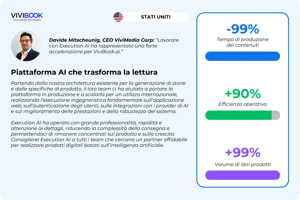 Per una trasformazione aziendale completa, il progetto può durare 2–6 mesi, includendo più processi interconnessi e scalabili. L’approccio modulare di Execution AI consente di misurare i risultati passo dopo passo, garantendo un ROI progressivo e sostenibile.