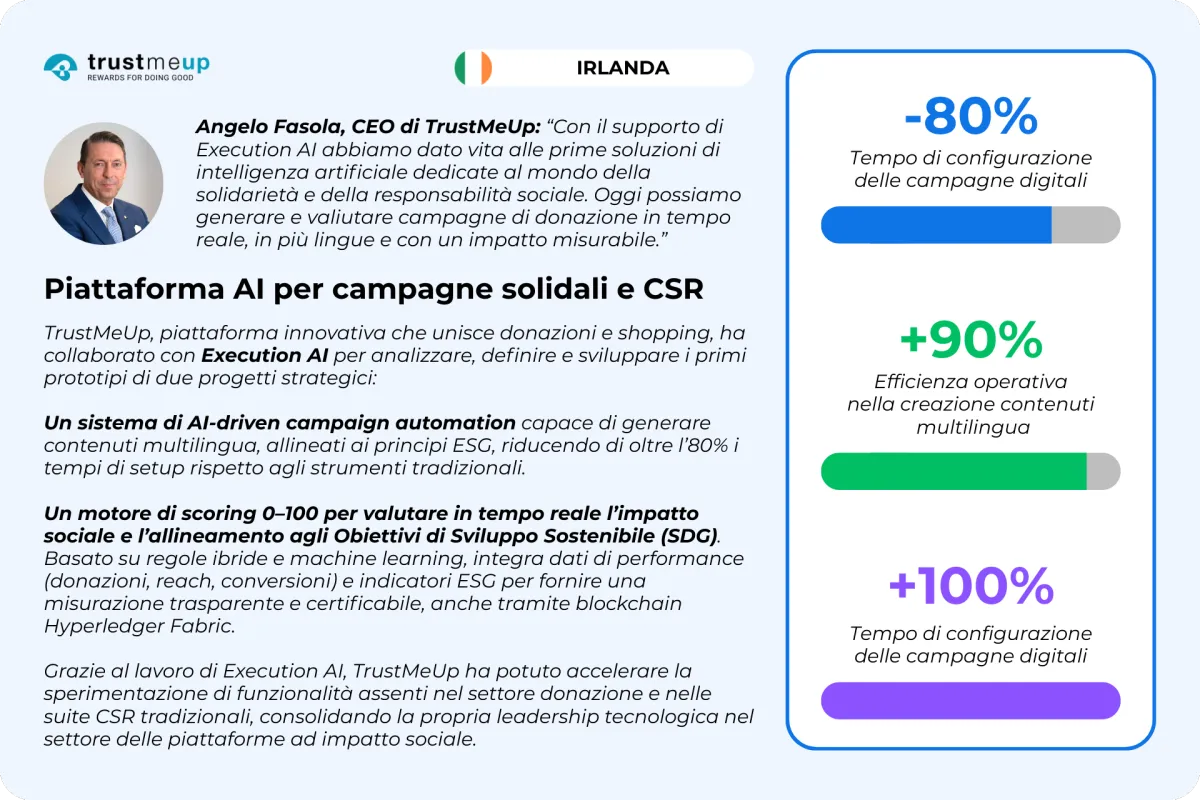 In Execution AI puntiamo a un ROI medio tra +120% e +300% nei primi 6-12 mesi, a seconda della complessità e del numero di processi automatizzati.