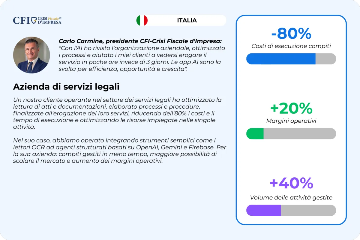 Gli studi di settore mostrano che l’adozione di AI per processi genera miglioramenti di produttività tra il 25% e il 45% e una riduzione dei costi operativi tra il 20% e il 60% entro il primo anno.